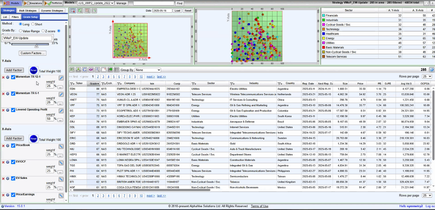 Symmetry initially used Alpha Vee Workstation to help generate buy lists of securities for use in various SMA models, including a multi-factor portfolio that focused on value, momentum and quality.